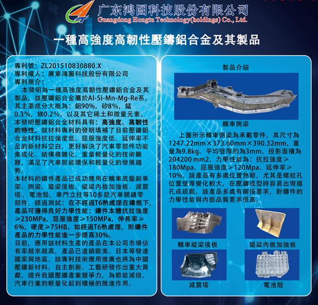 As a pioneer in the domestic die casting industry, Guangdong Hongtu has been committed to promoting the development of the industry through innovative technologies and developing independent intellectual property rights, and promoting the application and research of lightweight materials for automobile parts in China.