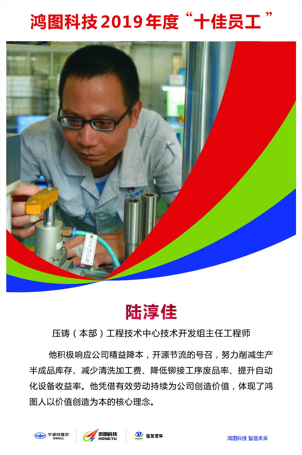 As a chief engineer in technical development team of Die-casting (Headquarters) Engineering Technology Center, Lu Chunjia is mainly engaged in technical breakthrough and production line design, etc. Since his entry, he has served as commissioning technologist, product engineer, process improvement engineer, technology development engineer and chief engineer, etc., and gradually grown from a basic employee of the production line to be a person responsible for the company's technical research and development.