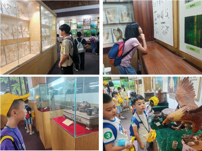 廣寧竹文化博覽館內(nèi)設(shè)有竹產(chǎn)品展示大廳、竹箸館、竹雕精品館、竹書館、竹標(biāo)本館、竹文房用具館六大主題分館。展覽體系完整、內(nèi)容豐富,涵蓋了竹的生物特性、歷史淵源、工藝傳承、文化藝術(shù)、生活應(yīng)用諸多方面。活動(dòng)當(dāng)日上午,孩子們一踏入竹文化博覽館,便被撲面而來的竹香和深邃的文化氛圍所吸引。在講解員的引導(dǎo)下,他們穿行于各館之間,通過不同主題的展館和竹藝作品,直觀感知“竹全身是寶”的生態(tài)價(jià)值與文化意義,進(jìn)一步理解了竹資源在地方經(jīng)濟(jì)發(fā)展和傳統(tǒng)工藝延續(xù)中發(fā)揮的重要作用。