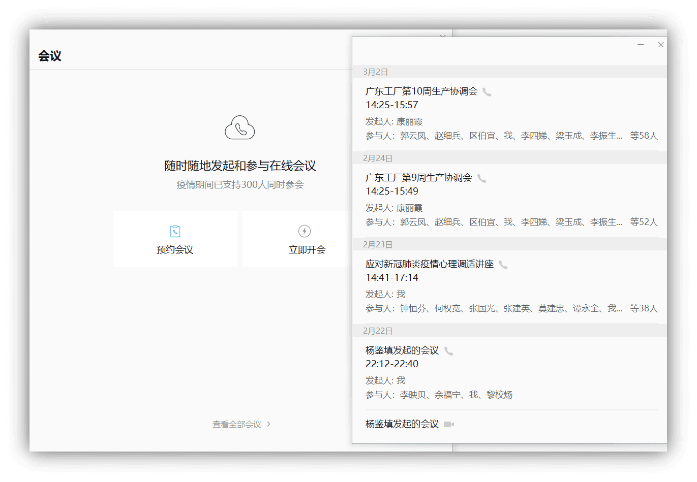 為保障疫情期間各部門的有效溝通,信息化團隊對多款遠程會議系統進行功能、場景測試,最終上線了企業微信網絡會議功能。該系統可直接通過人事系統平臺隨時隨地發起音/視頻會議,并遠程共享會議資料。自2月3日上線以來,累計發起遠程網絡會議 783 次,總計時長 16791 分鐘。