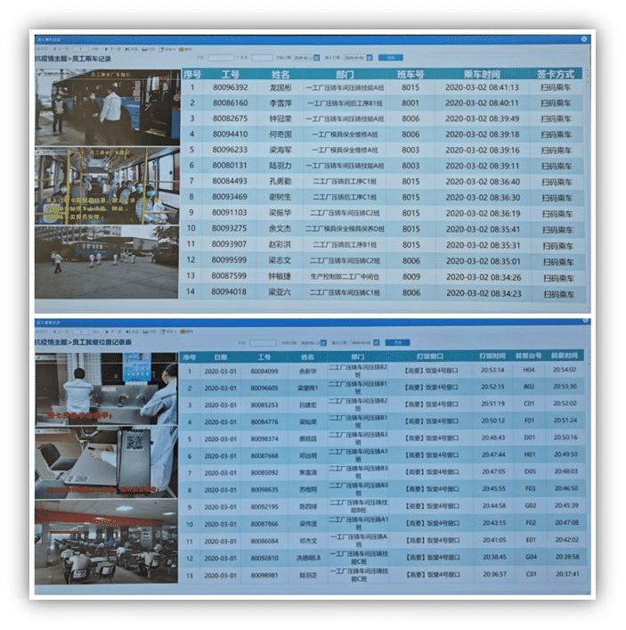 復工復產后,如何對員工的乘車和就餐過程進行精確追蹤是疫情防控工作的難點。對此,信息化團隊協同行政部、品質部,在現有人事一卡通系統平臺上,開發了二維碼信息對接系統,該系統可自動對接班車、打飯窗口、就餐座位等的信息。經過緊張的內部功能測試和程序優化,該系統在復工前已正式投入使用。截至目前,系統已累計產生數據68000多條,隨著復工人數的增加,數據將不斷被記錄和分析,為全面有序復工打好基礎。